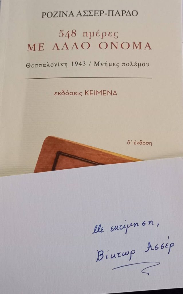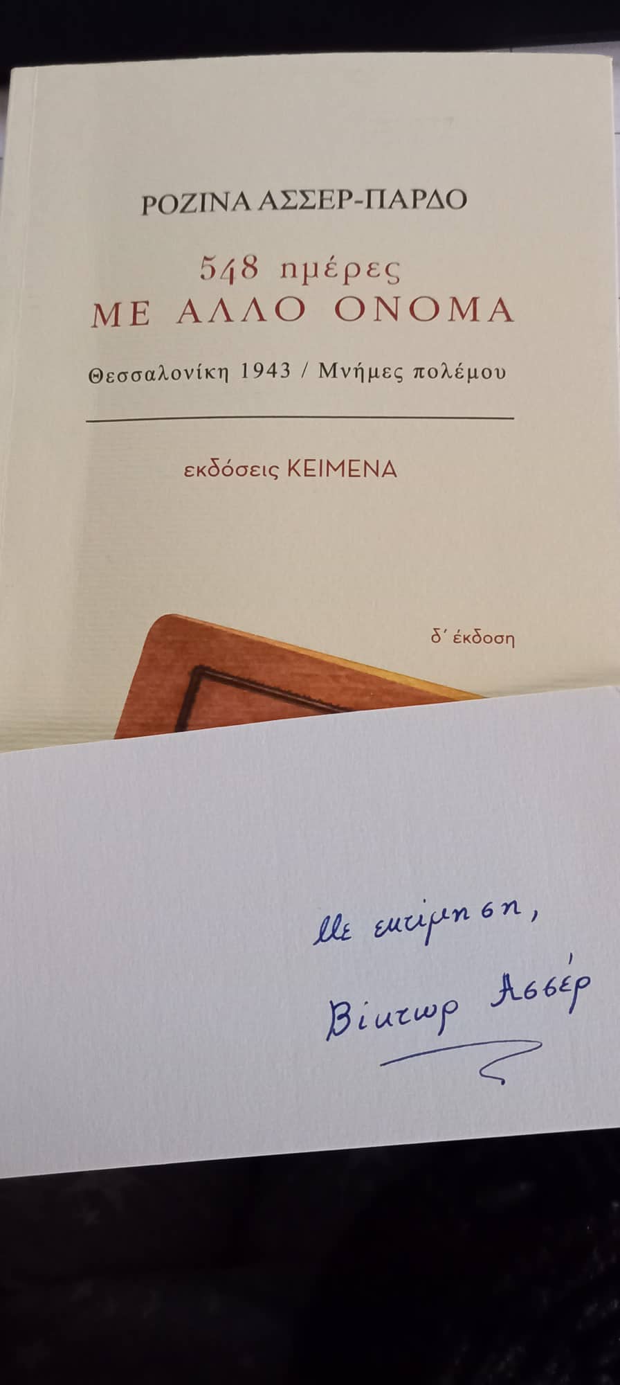 Το 2021 ξεκίνησα μαθήματα σεφαραδίτικων με τον δάσκαλο Τζέκυ Μπενμαγιόρ. Ένας από τους συμμαθητές μου ήταν (και είναι) ο Βίκτωρ. Στα μαθήματα τους έλεγα για το ντοκιμαντέρ και πως πρόβαλα μερικά αποσπάσματα από αυτό στα παιδιά στο σχολείο για να μάθουν, να γνωρίσουν εκείνα τα παιδιά. Ο Βίκτωρ κάποια στιγμή μού ζήτησε τη διεύθυνσή μου για να μου στείλει κάτι. Μου έστειλε το βιβλίο της. Αυτό που τώρα κρατούσα στα χέρια μου και ανακάλυπτα ότι ήταν το ημερολόγιο που κρατούσε, ούσα παιδάκι 10 χρονών, κρυμμένη και φοβισμένη. Mόλις είχα συνειδητοποιήσει πως ο Βίκτωρ, ο συμμαθητής μου, ήταν ο γιος της Ροζίνας.