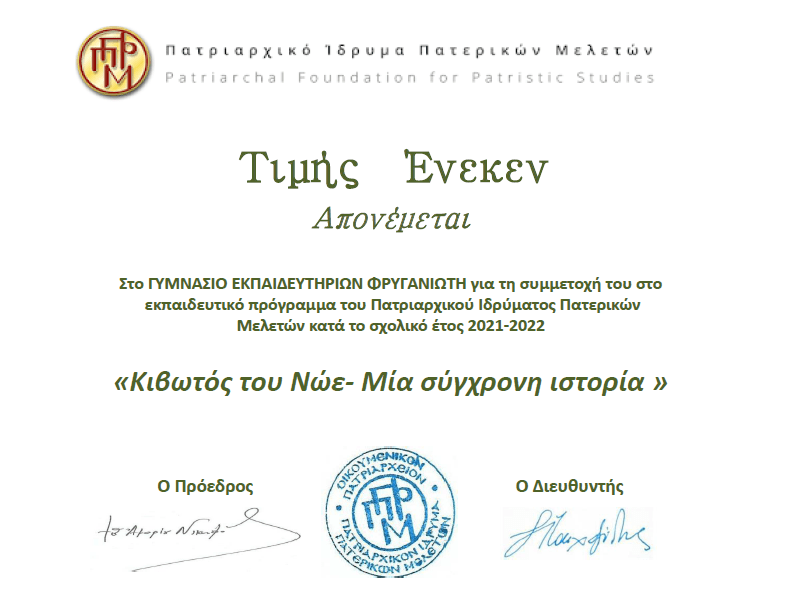 Δράση που εκπονήθηκε στο πλαίσιο του εκπαιδευτικού προγράμματος του Πατριαρχικού Ιδρύματος Πατερικών Μελετών, «Κιβωτός του Νώε, μια Σύγχρονη Ιστορία». 20 μαθητές και μαθήτριες της Α’ Γυμνασίου, δημιούργησαν ένα ημερολόγιο διάσωσης, δηλαδή ένα αφιερωματικό ηλεκτρονικό περιοδικό στο οποίο έγραψαν άρθρα και αφιερώματα σχετικά με τα 4 άγρια ζώα που υιοθετήθηκαν εικονικά από το Κέντρο Περίθαλψης «Δράση για την Άγρια Ζωή». Ένας σκαντζόχοιρος, μια καρδερίνα, ένα βραχοκιρκίνεζο και μια γερακίνα, φιλοξενήθηκαν κατά τη χειμερινή περίοδο στο κέντρο περίθαλψης, ενώ τα έξοδα για τα φάρμακα και τη σίτισή τους καλύφθηκαν από τους μαθητές μας. Οι υπεύθυνοι του κέντρου αφού ενημέρωσαν διαδικτυακά τους μαθητές για τον σκοπό της εικονικής υιοθεσίας του ζώου, τους ενημέρωναν συχνά για την πορεία της υγείας των ζώων, ώσπου αυτά απελευθερώθηκαν στο φυσικό τους περιβάλλον.