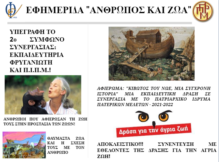 Δράση που εκπονήθηκε στο πλαίσιο του εκπαιδευτικού προγράμματος του Πατριαρχικού Ιδρύματος Πατερικών Μελετών, «Κιβωτός του Νώε, μια Σύγχρονη Ιστορία». 20 μαθητές και μαθήτριες της Α’ Γυμνασίου, δημιούργησαν ένα ημερολόγιο διάσωσης, δηλαδή ένα αφιερωματικό ηλεκτρονικό περιοδικό στο οποίο έγραψαν άρθρα και αφιερώματα σχετικά με τα 4 άγρια ζώα που υιοθετήθηκαν εικονικά από το Κέντρο Περίθαλψης «Δράση για την Άγρια Ζωή». Ένας σκαντζόχοιρος, μια καρδερίνα, ένα βραχοκιρκίνεζο και μια γερακίνα, φιλοξενήθηκαν κατά τη χειμερινή περίοδο στο κέντρο περίθαλψης, ενώ τα έξοδα για τα φάρμακα και τη σίτισή τους καλύφθηκαν από τους μαθητές μας. Οι υπεύθυνοι του κέντρου αφού ενημέρωσαν διαδικτυακά τους μαθητές για τον σκοπό της εικονικής υιοθεσίας του ζώου, τους ενημέρωναν συχνά για την πορεία της υγείας των ζώων, ώσπου αυτά απελευθερώθηκαν στο φυσικό τους περιβάλλον.