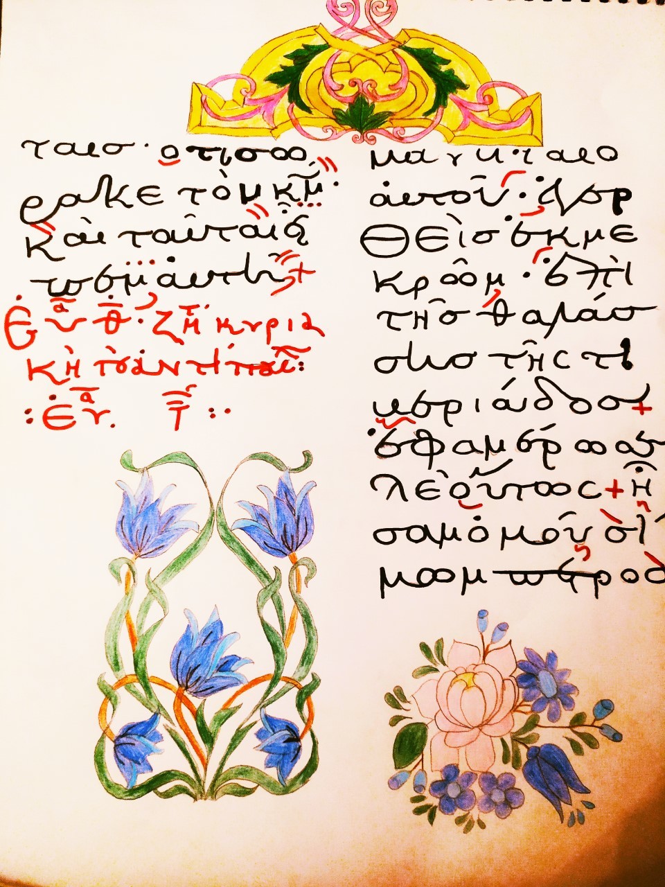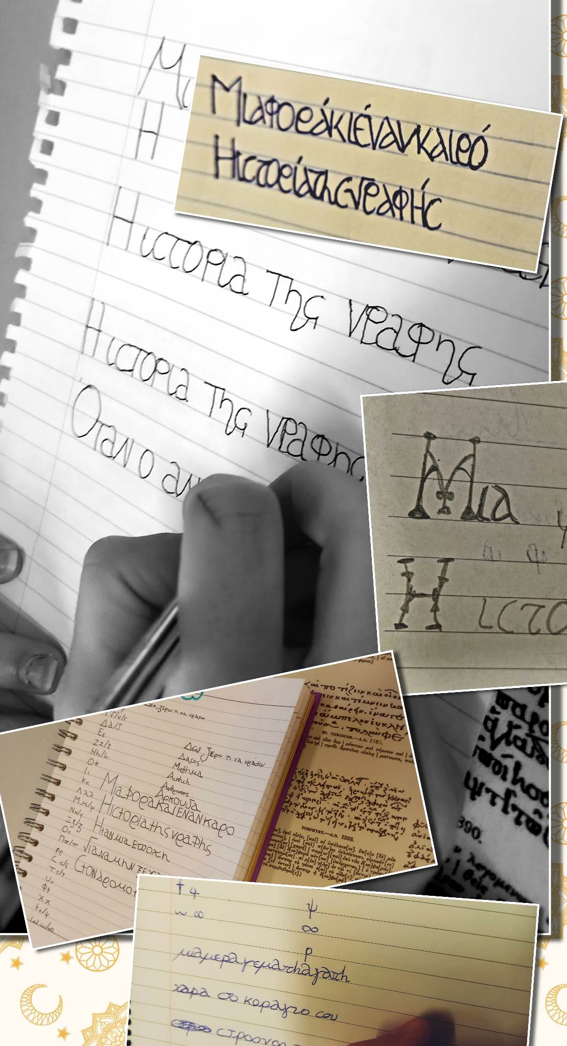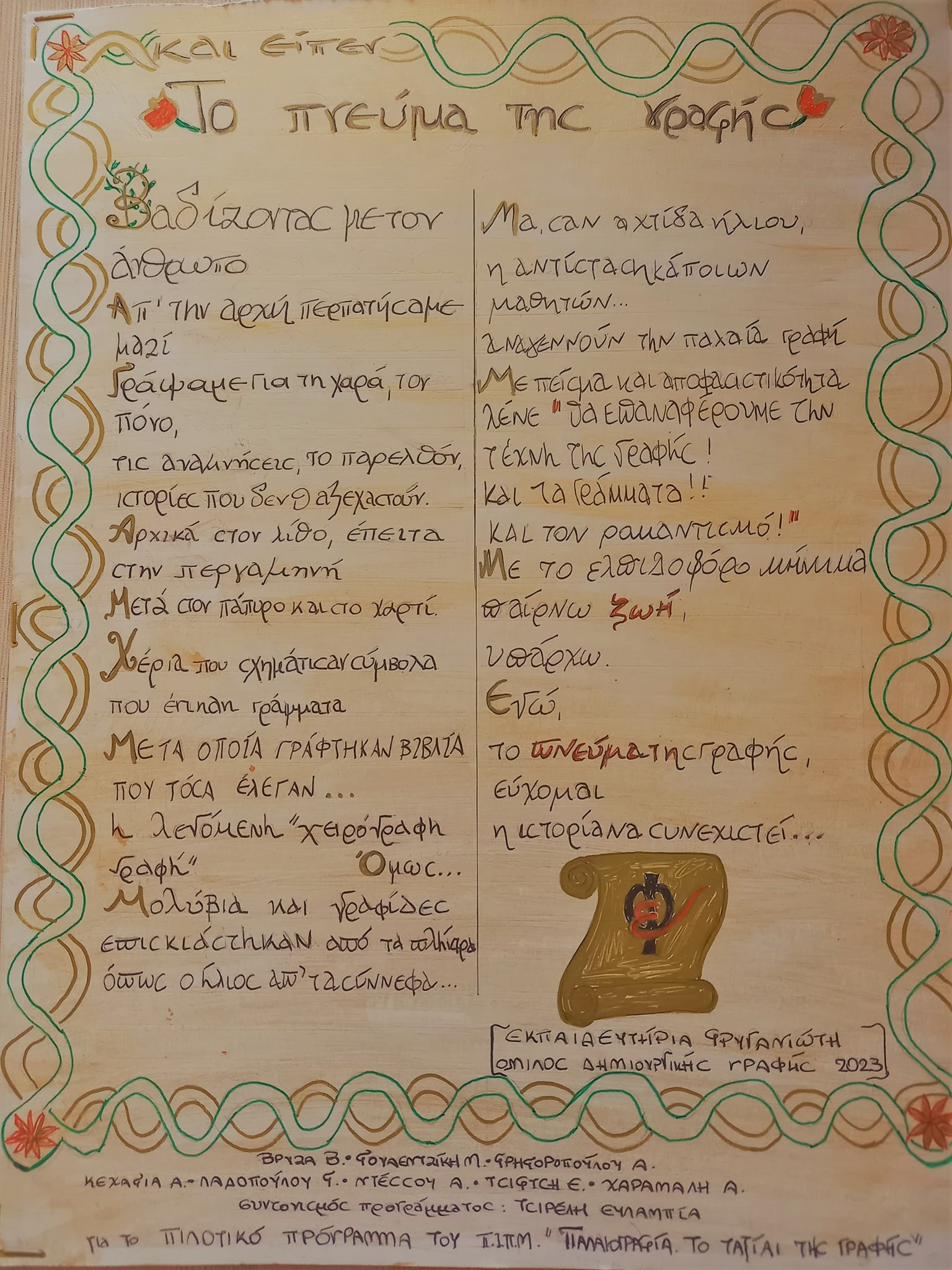 Με πρώτη ύλη το επιτυχημένο πρόγραμμα “Ταξίδι της Γραφής, ψηφιοποίηση χειρογράφων” (βλ. παρακάτω) που ολοκληρώσαμε πριν δύο χρόνια και που βραβεύτηκε, με παράλληλη συμμετοχή των έργων των μαθητών σε έκθεση που εγκαινιάστηκε από τον Οικουμενικό Πατριάρχη στο Σισμανόγλειο Μέγαρο της Κωνσταντινούπολης, φέτος (2022-’23) πειραματιστήκαμε στην Τέχνη της Παλαιογραφίας.